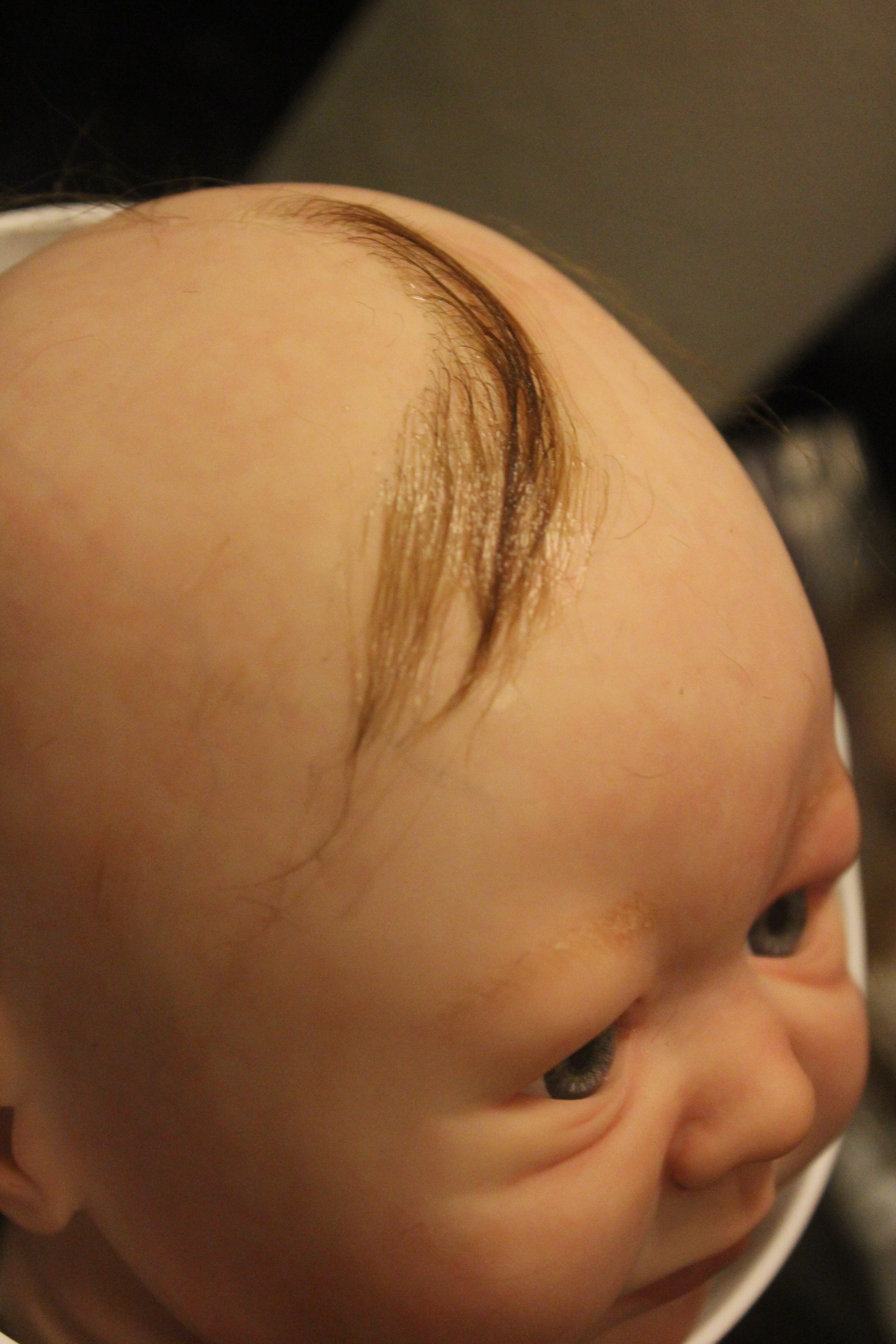 And the rooting? Well, besides my finer gauge rooting needles still not having arrived, I’m spending more time plucking out extra hairs than I seem to be rooting. And I’m also playing around with improving my swirl. I was decently pleased with Carson’s finished head (for a first try). Also given how terrified of rooting I was. But already, things are going SOOOOO much better with “Aubrey”. I even gave her rooted brows. It’s likely hard to tell, in the pics, but they’re there. Another terrorizing skill I’m tackling.
