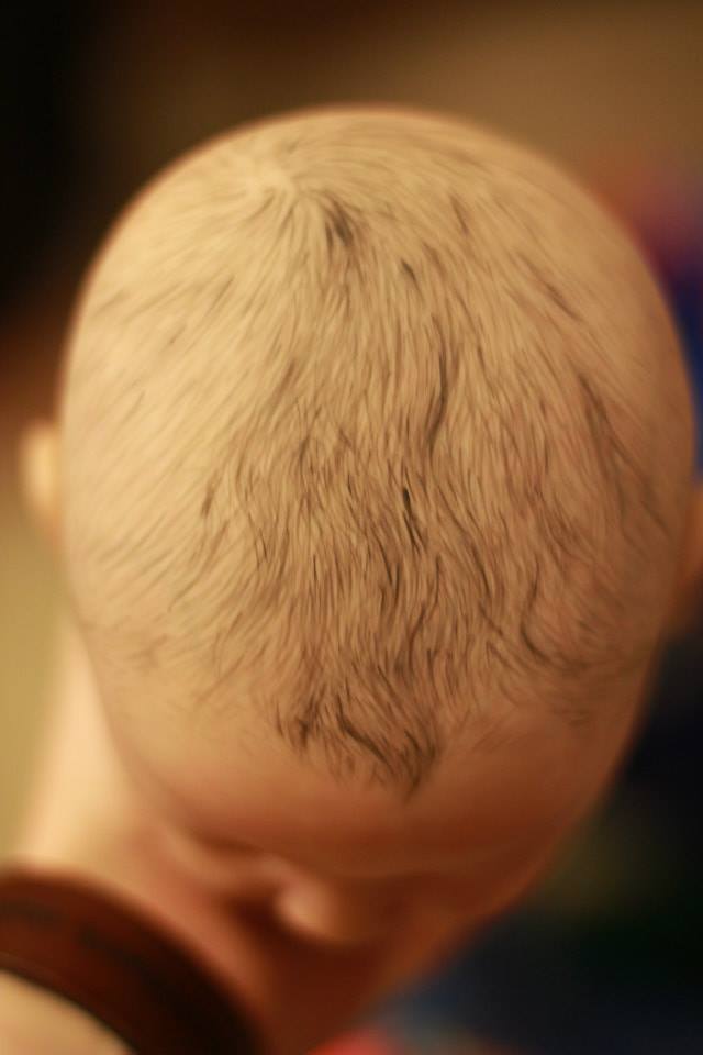 Thing is, I love the look of an amazing head of painted hair. I mean, I LOOOOVE it. I have now amassed — likely — the largest library of painted hair babies ever. I mean, it’s enormous. I just save and pin and save and reference and pin some more. And most of it, I have no idea how to do yet. I mean, it looks simple in theory, and I do paint hair for a living. I mean, portrait art isn’t so difference. Except on a three dimensional skull, it sort of is. And the physical mediums. They have a learning curve. Finding the right colours to add dimension without ending up with salt & pepper on a newborn head. :p
