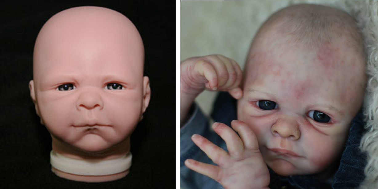 His skin has been sealed with matte varnish to keep him shine free permanently and dewy skin finish was used to create realistic, still soft to the touch, newborn skin texture. Shine was added to the corners of his eyes, lips and nostrils. Baby Jasperβs hair was micro painted one follicle at a time using two tones for dimension and textured to feel like real hair using thick medium & look alive premium thinner that adds gloss to each strand – the effect being an ultra realistic head of painted hair that will always look and feel perfect!