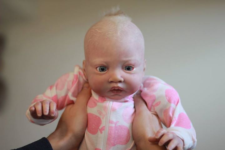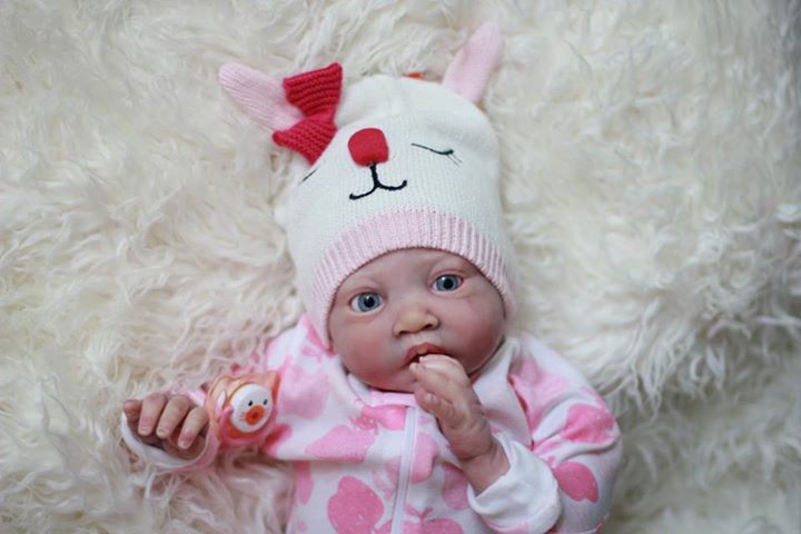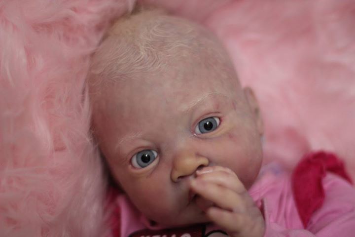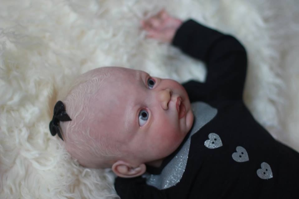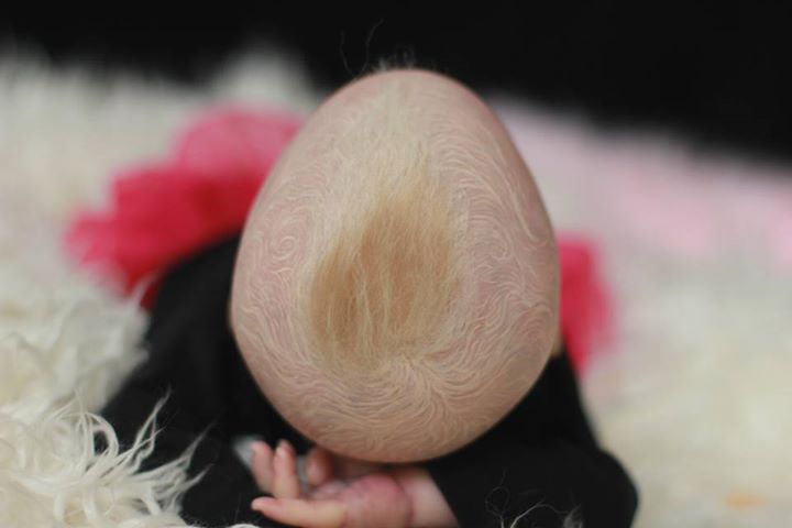Her skin has been sealed with matte varnish to keep her shine free permenantly and dewy skin finish was used to create realistic, still soft to the touch, newborn skin texture. Shine was added to the corners of her eyes, lips and nostrils. Baby Winter’s hair was micro painted one follicle at a time using two tones for dimension and rooted using slumberland mohair – the effect being an ultra realistic head of painted hair that will always look and feel perfect, no styling required! I am open to offers on her, as has a flaw under her hair. Painted her hair twice, but both times the paint cracked where the hair was rooted. Have rooted her thick through the crown so it is only visible when her hair is moved. Looks like cradle cap. *see pics. Was selling her for $449 OBO (as a baldy, regularly she’d be $599).