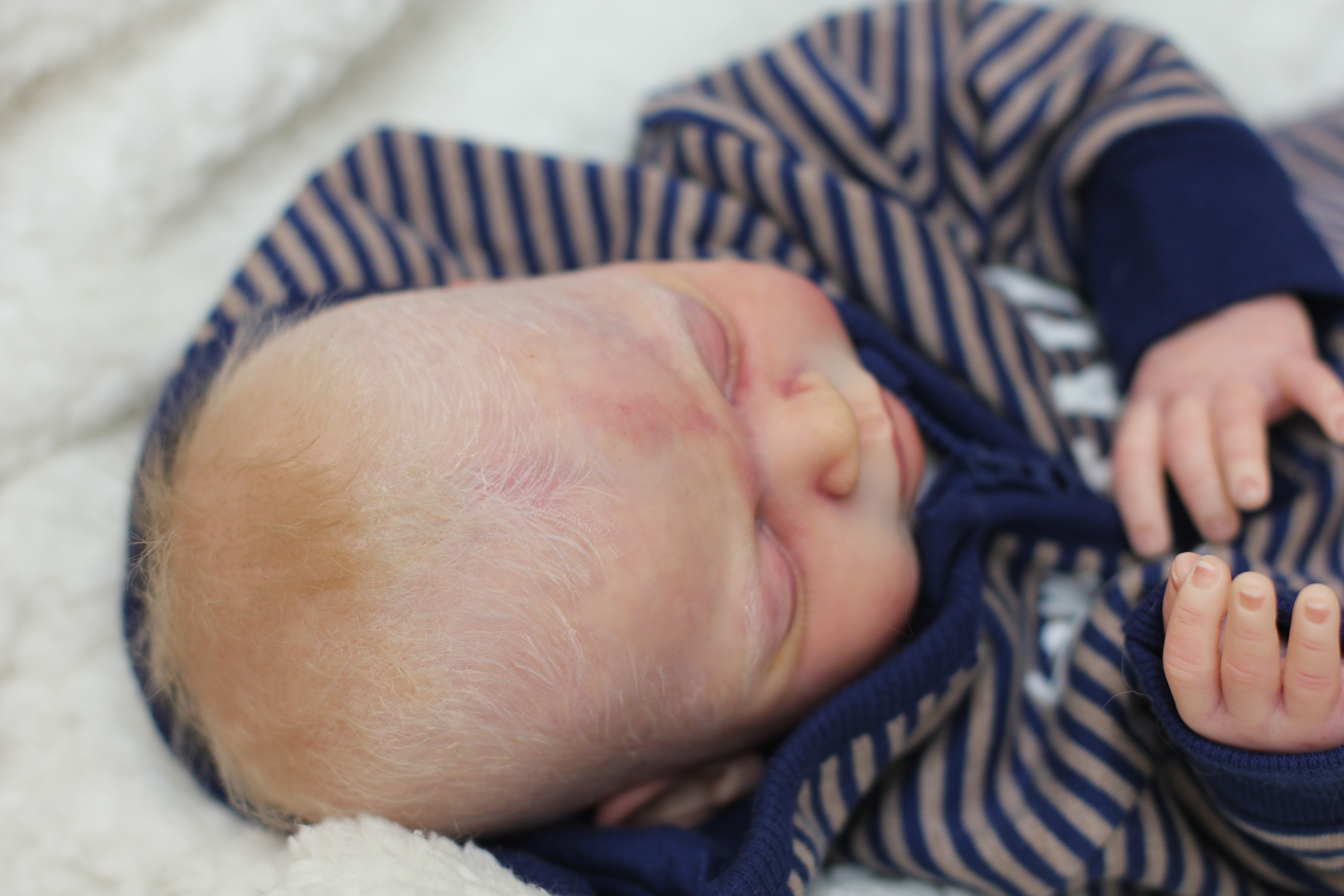 He was micro rooted, a fully rooted baby before. And well, pretty sure everyone knows by now. I hate hair. The maintenance esp. I just far prefer a combi head.Β So despite my fear to paint his hair, I did it anyway. I removed his sealant, and pulled out everything I’d rooted until I got to the crown.Β Then I trimmed the remaining hair super short. I knew the moment I had his hair trimmed and in that little thick tuft, it was the best decision I made. Because he looked incredible without any paint.Β Then I painted him. Incidentally, the combi look isn’t one I’d ever have tried out. Because it’s thicker than I’d ever done. BUT it was perfect. And changed how I combi forever. I painted his hair using pale blond (beige and flesh tone strokes). Again, not how I might’ve done it, but what I was working with to match his blond mop. And the finished product was soooo cute I again took a trillion pics of him. I am sooooo happy with it. And although I don’t think my son looked anything like this when he was born (he was more strawberry blond at birth) I do loooove it immensely on this doll. And def something I may reproduce exactly on my Linus (depending on artists’ availability for painting his hair for me; too afraid I’ll focus only on the flaws if I paint Linus’ hair myself. Oh to be a perfectionist! :P)