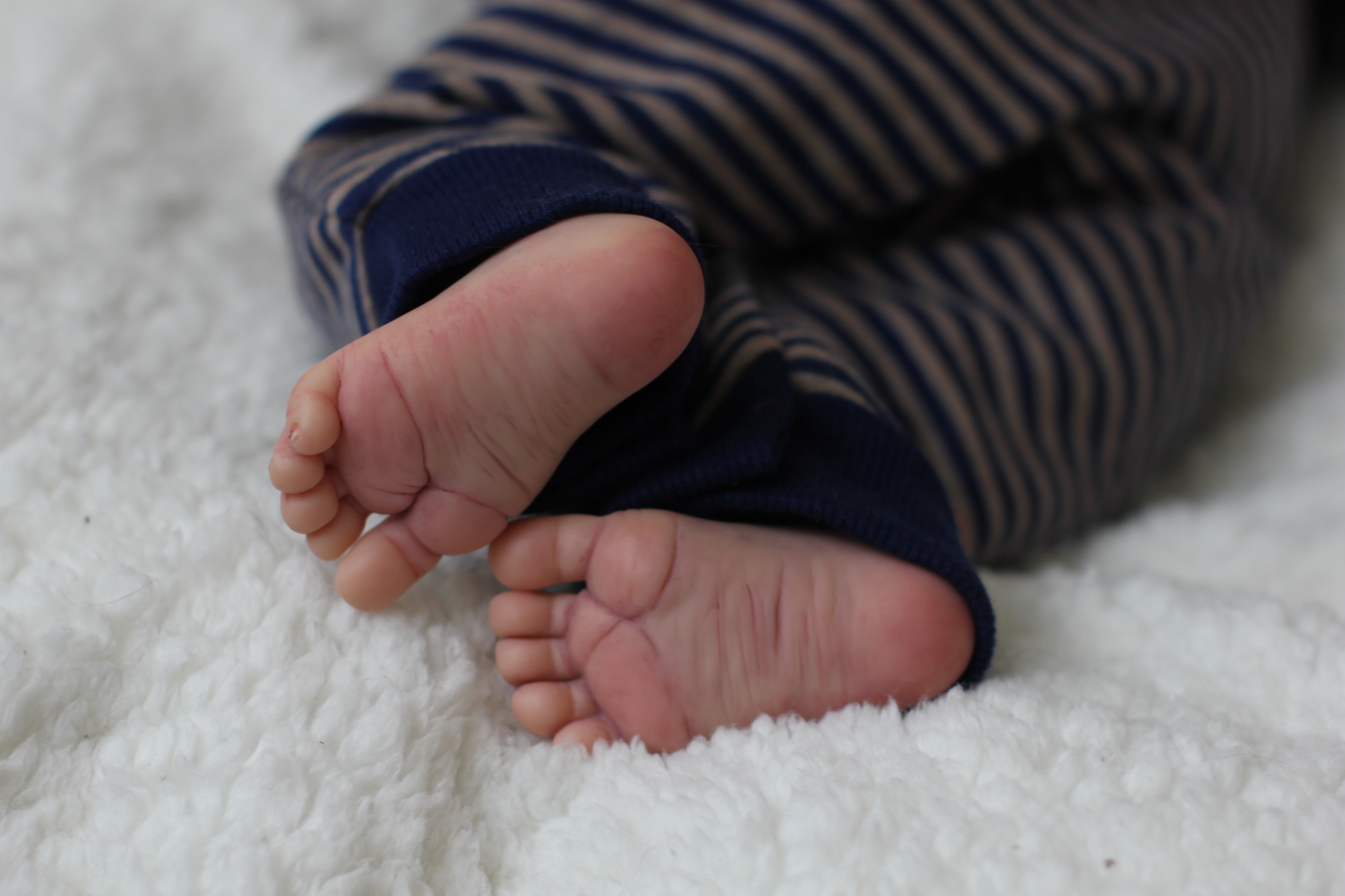 Blake’s body is the cotton, cable tied. He has full arms and 3/4 legs, perfect for tank top onesies. His limbs and head have been sealed and weighted. His body is weighted in all the right places to give him an authentic newborn feel (perfect for cuddles). Limbs have been filled with glass beads and polyfil, with glass beads in a sealed sac in her torso and head (so nothing will leak). No sand is in her body so he can travel worldwide! His eyelashes are slumberland mohair (best of its kind) & have been rooted & sealed so they’ll never fall out.