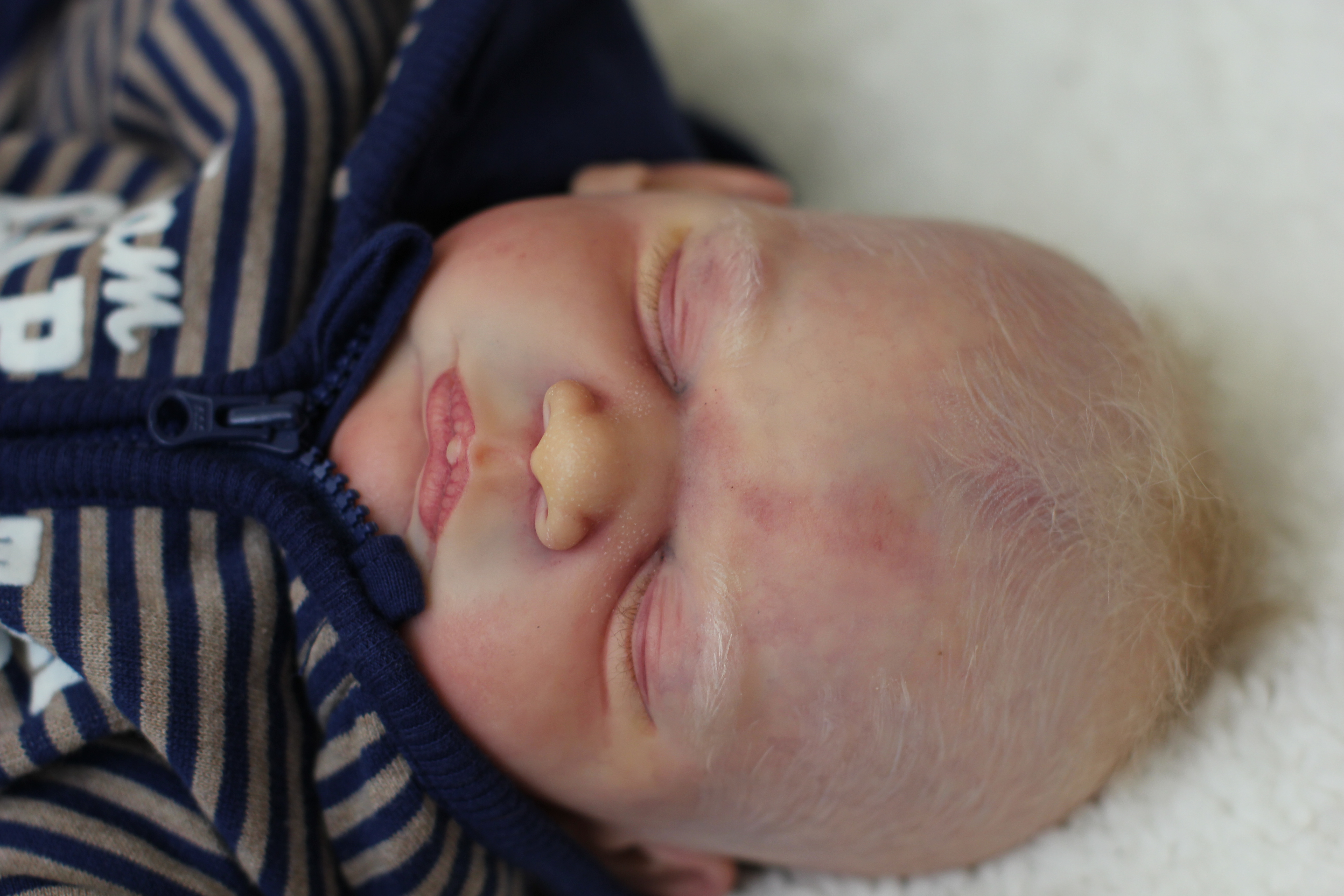 Blake is the Lane sculpt by Sandra White! He has been meticulously painted using Genesis Heat Set paints – custom mixed for a completely unique skin tone, complete with blue and yellow undertones, and over five layers of mottling for ultra realism. His capillaries and blushing is blended well with tiny milia on his button nose.